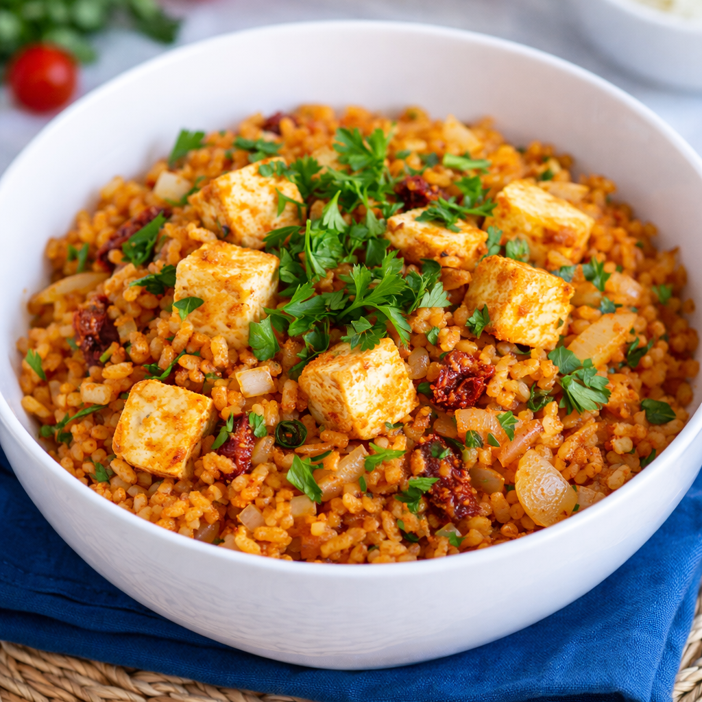 Marinated overnight tofu, golden-seared to perfection, sitting on a bed of spiced cauliflower rice and draped in a rich masala sauce.